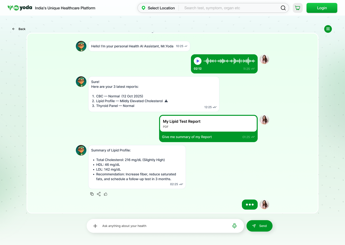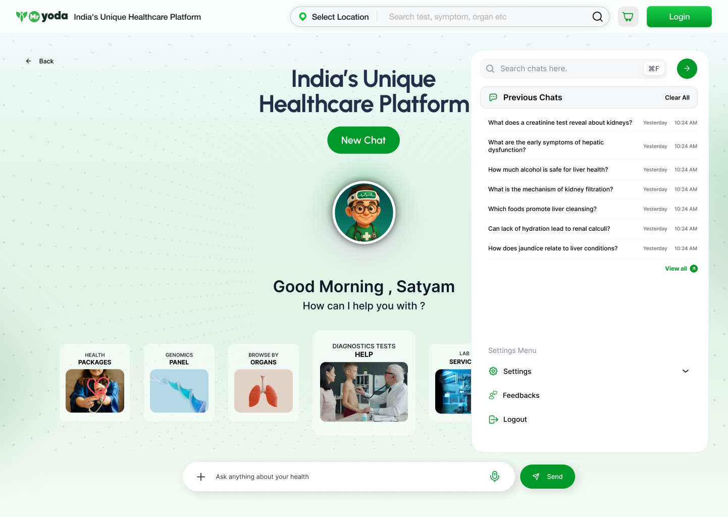 The Chatbot AI was developed as a core feature of the Mr. Yoda ecosystem—aimed at simplifying how users approach health information. Instead of browsing multiple pages, users can now ask questions, describe symptoms, or select categories, and instantly get guided towards the right tests, packages, or specialists.