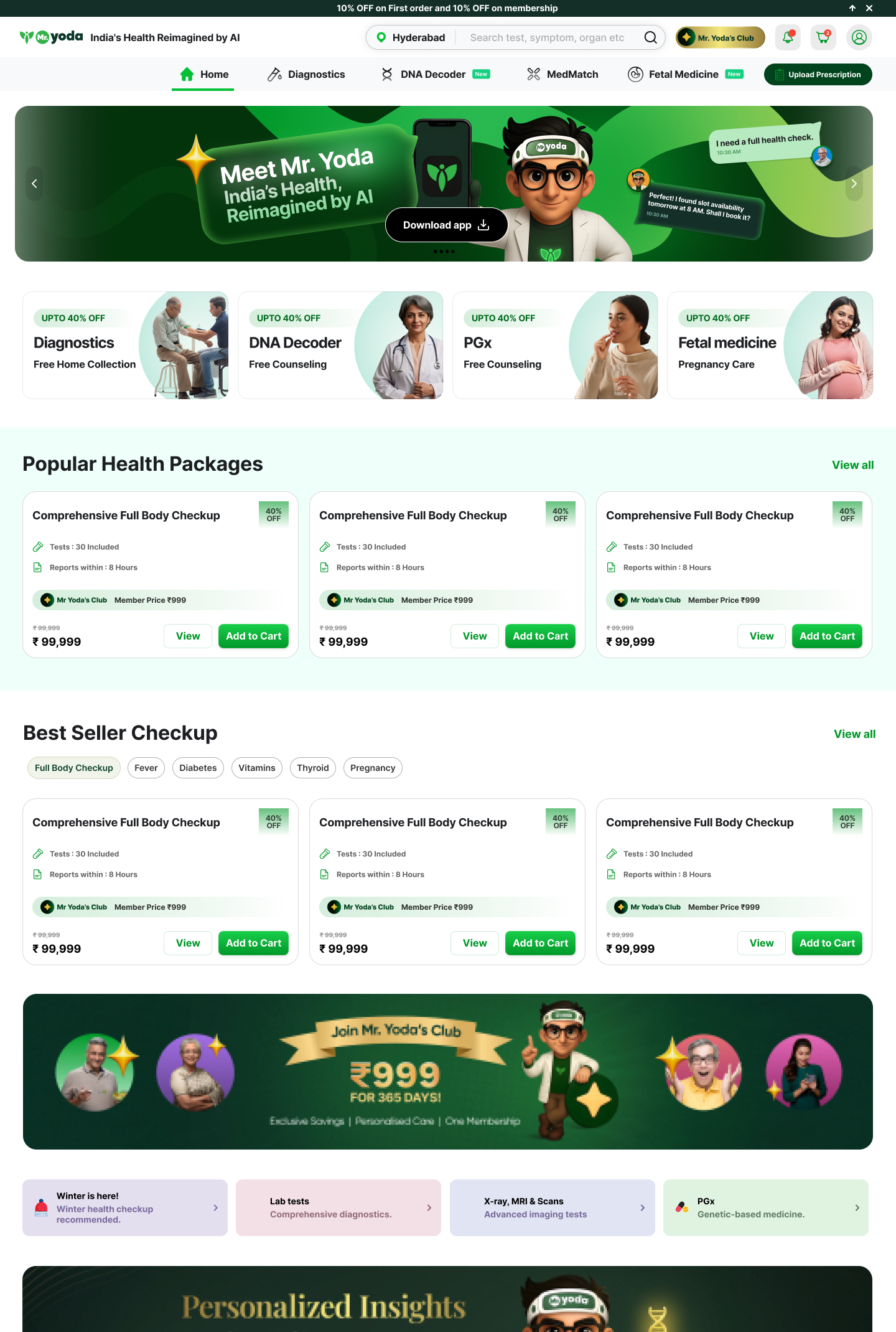 Mr. Yoda is an AI-powered health diagnostic platform that helps users understand symptoms, book tests, access health packages, and get personalized guidance. The goal was to transform their existing platform into a more structured, modern, and trustworthy digital experience that reflects the brand’s mission — “India’s Health, Reimagined by AI.”